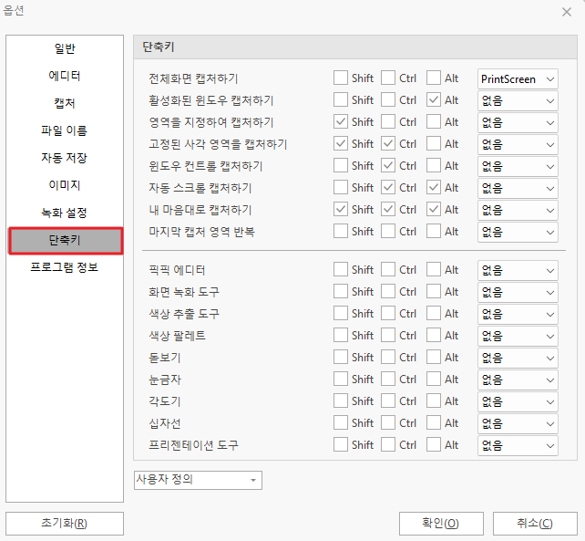 단축기 같은 경우에는 영어, 숫자 등으로도 설정할 수 있긴한데 PrintScreen으로 사용하는 것이 제일 나은거 같다.