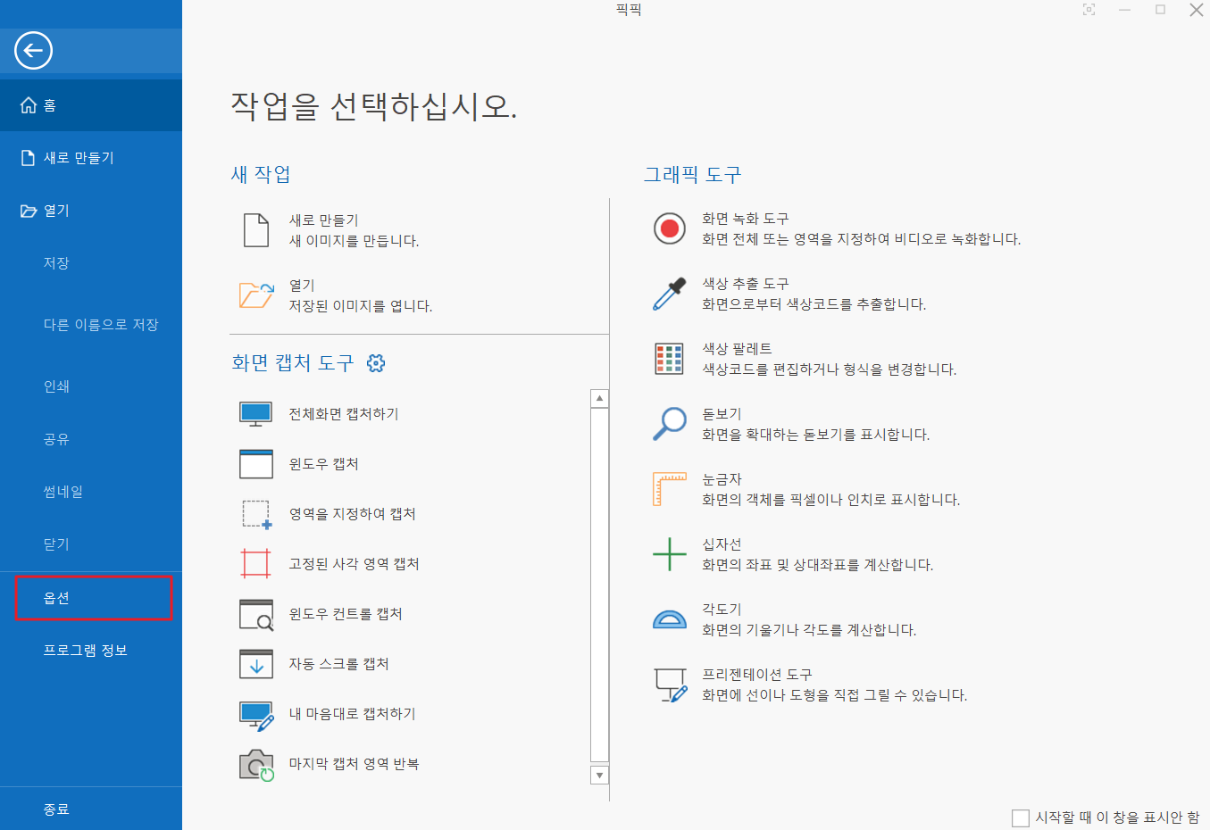 2. 그러면 설치가 끝이다. 이후 캡처 기능 등의 단축키를 설정하고 싶으면 "옵션 → 단축키"에서 설정해주면 된다.