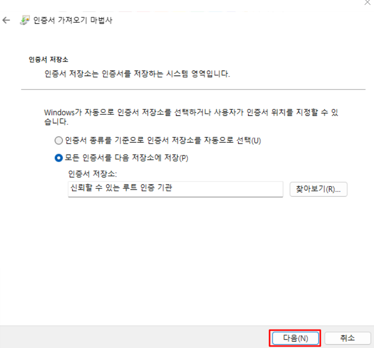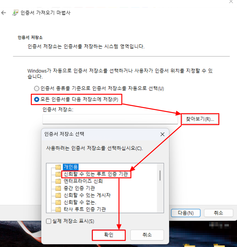 4) '모든 인증서를 다음 저장소에 저장' 클릭 후