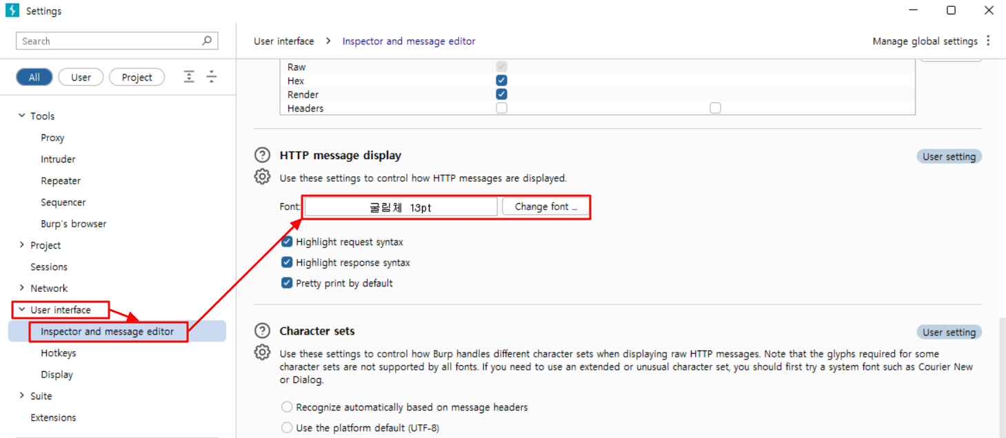 Proxy → Proxy settings에서 설정할 수 있으며 다음과 같이 설정하면 된다. Response 부분도 꼭 설정을 해줘야지 요청을 보냈을 때 응답값을 제대로 볼 수 있다.