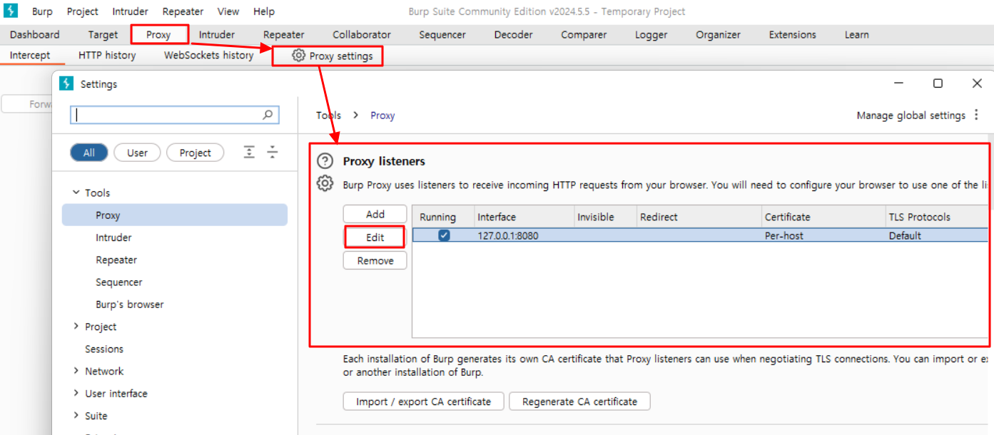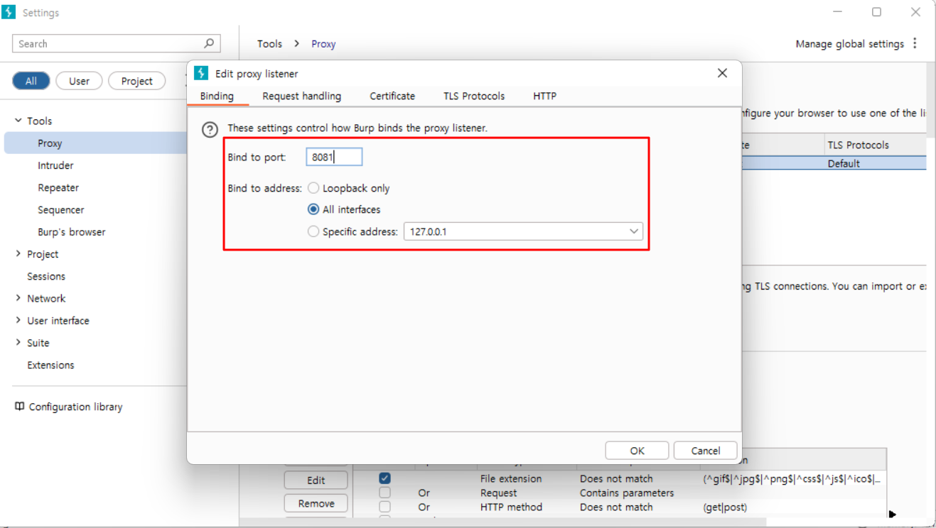 Proxy → Proxy settings → Proxy listeners → Edit 클릭 원하는대로 설정 변경해주면 된다.