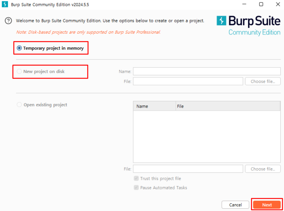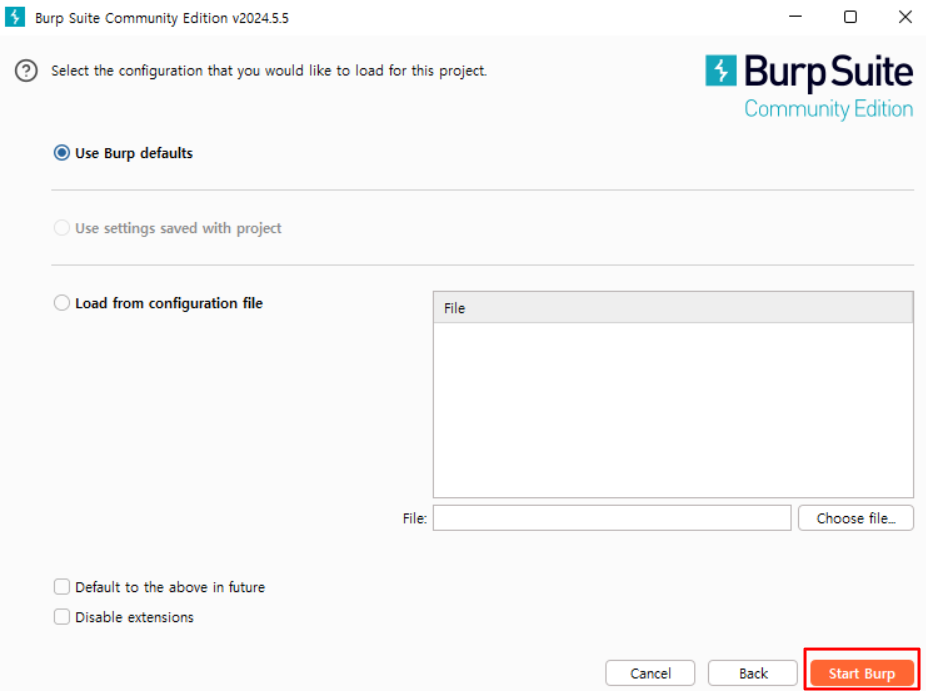 3) Start Burp 클릭하면 Burp가 실행된다.