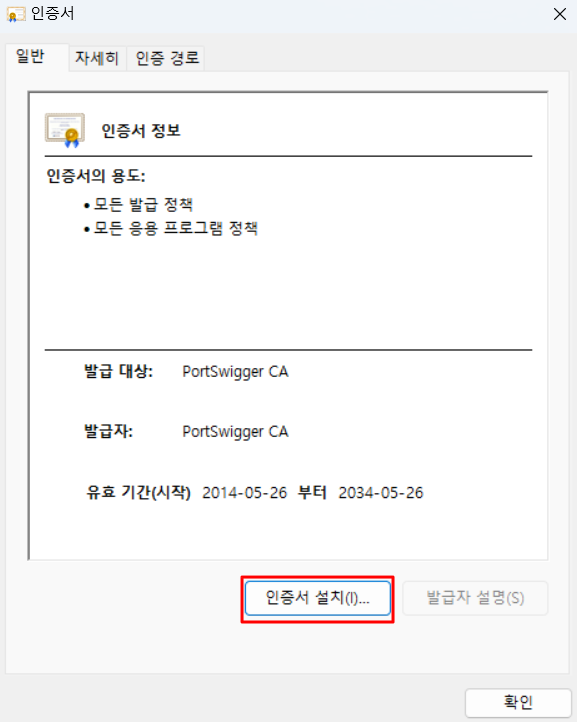 1) 이제 기본적으로 Burp Suite를 사용하기 위한 프록시 설정이 필요하다. Burp Suite의 프록시 설정과 내가 사용하고 있는 컴퓨터(윈도우)의 프록시 설정을 통해 서로를 연결시킨다. 일단 CA 인증서를 먼저 설치해줘야 한다.