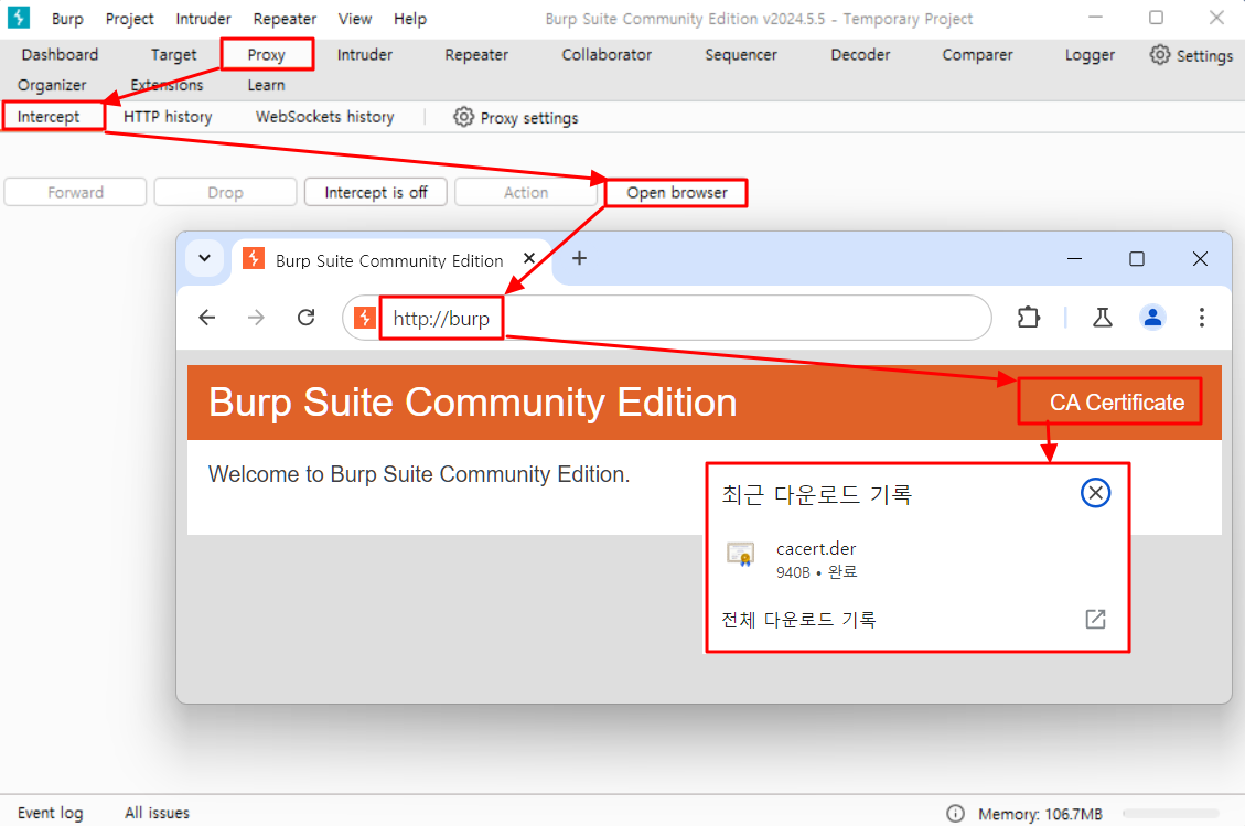 Proxy → Intercept → Open browser 클릭 하면 브라우저 창이 나타난다 → 브라우저 창에 'http://burp' 검색 후 → CA Certificate 클릭하면 'cacert.der' 인증서가 다운로드 된다.