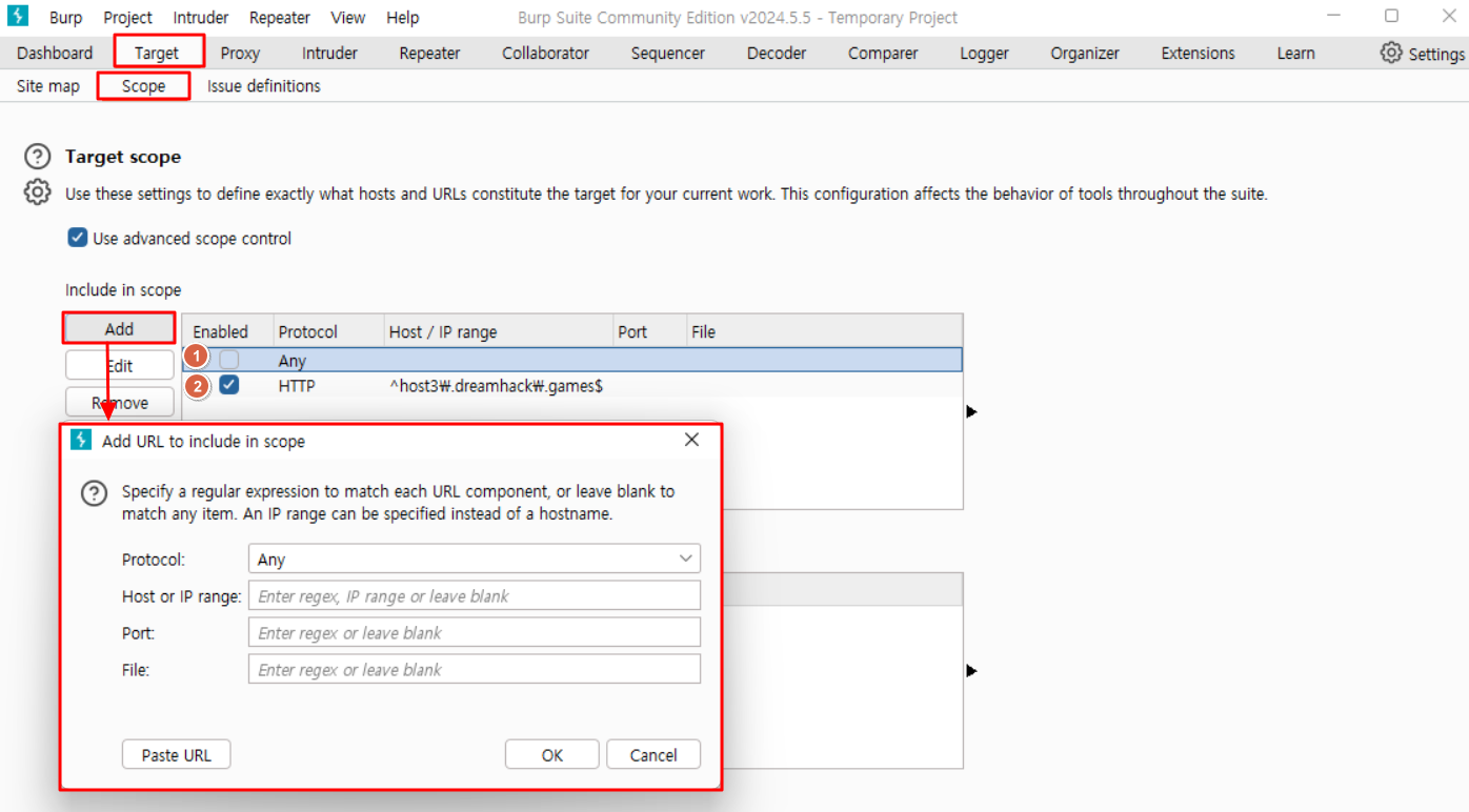 'Target → Scope → Use advaced scope control 클릭 → Add'를 통해 추가할 수 있다.