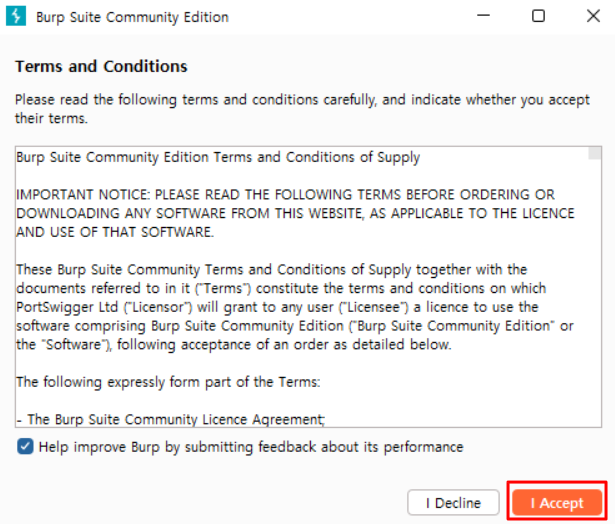 1) Burp Suite를 실행 시킨 후 'I Accept' 클릭