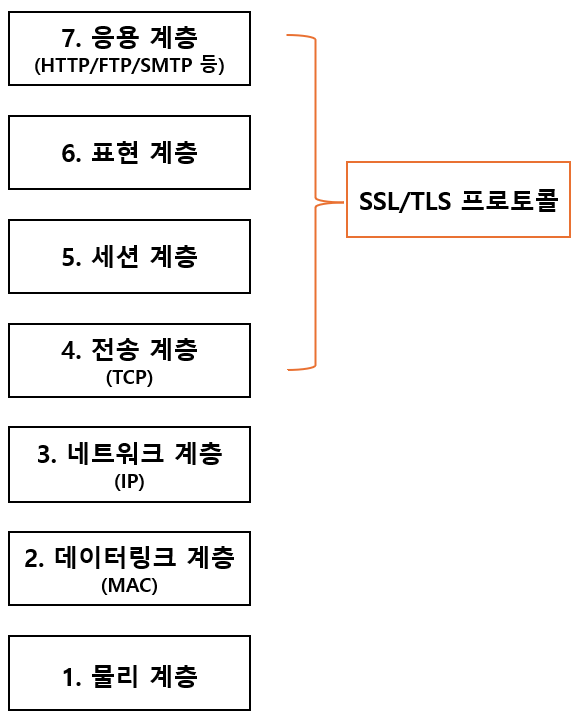 SSL/TLS는 보안 계층이라는 독립적인 프로토콜 계층을 만들어 응용계층과 전송계층 사이에서 동작한다.