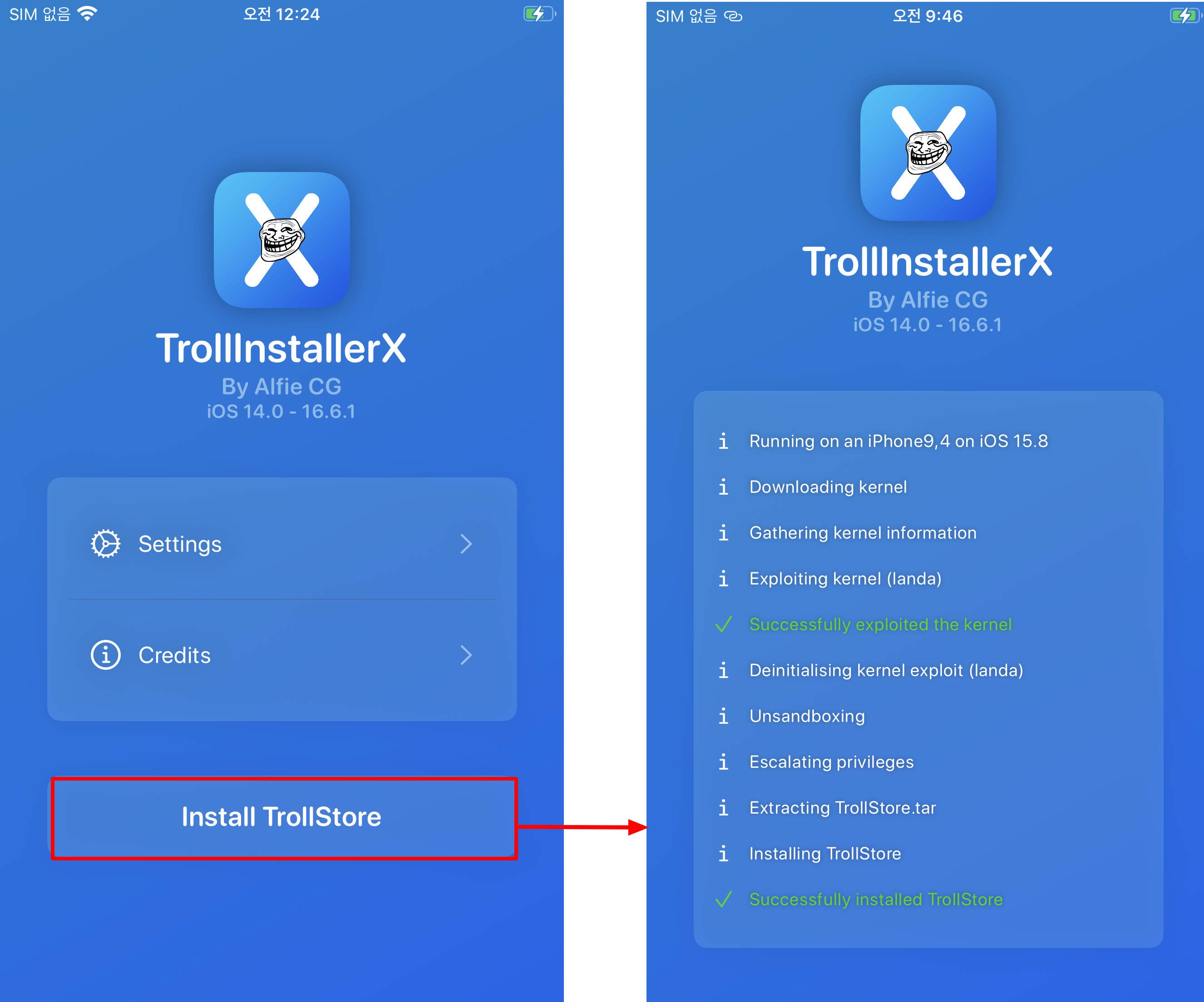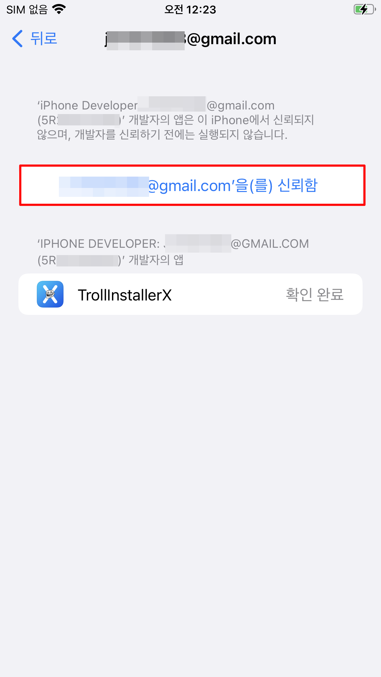 그러면 TrollInstallerX가 단말기에 정상적으로 설치가 된다. 하지만 앱을 클릭하면 '신뢰할 수 없는 앱'이라고 뜨기 때문에 신뢰 설정을 해줘야 한다.'설정 → 일반 → VPN 및 기기 관리 → 신뢰함 클릭' 그러면 정상적으로 앱 사용이 가능해진다.