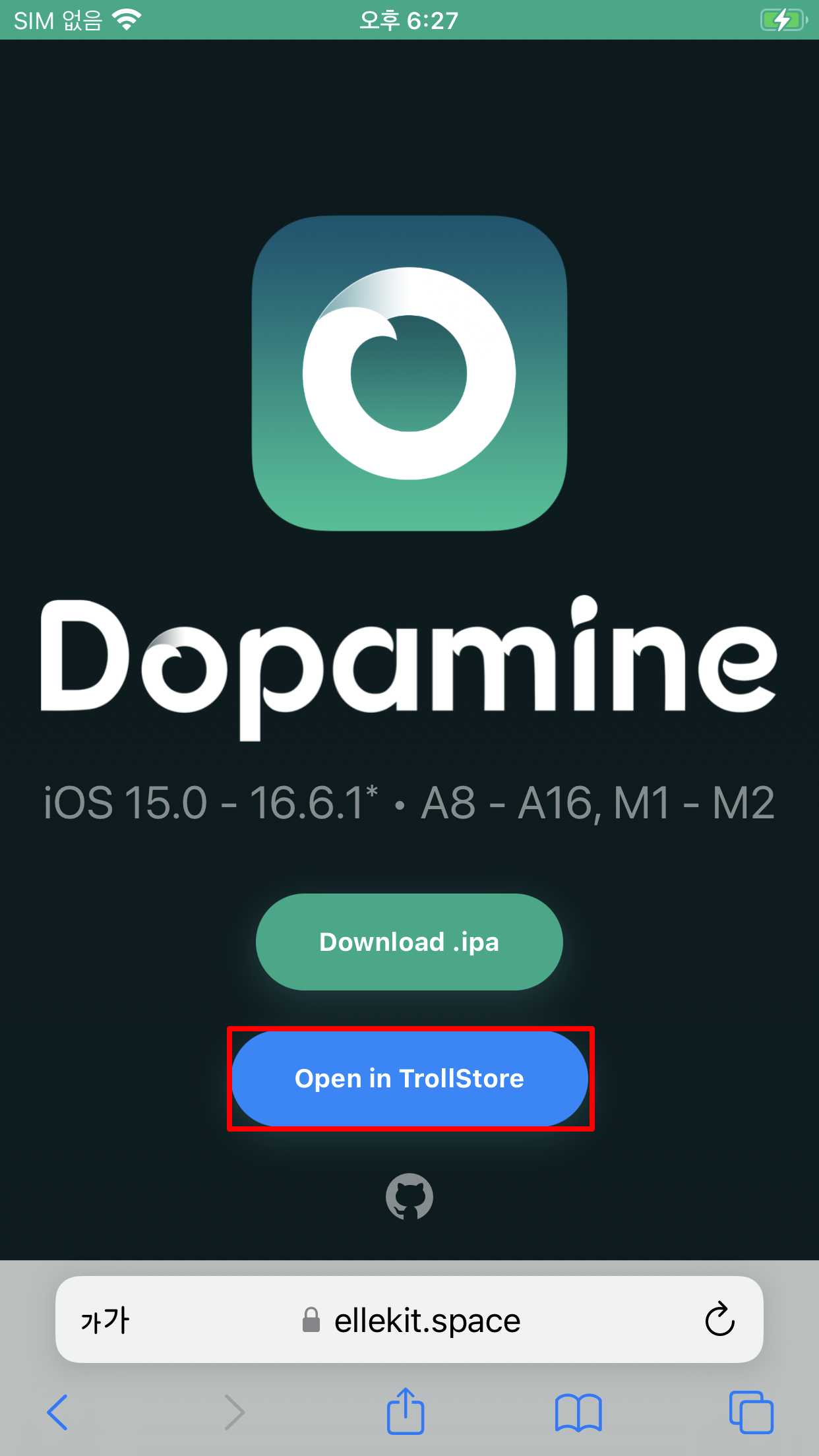 도파민(Dopamine) 설치를 위해 Safari를 연 다음 https://ellekit.space/dopamine/ 에 접근 후 → Open in TrillStore 클릭 → 열기 클릭 → 설치 클릭