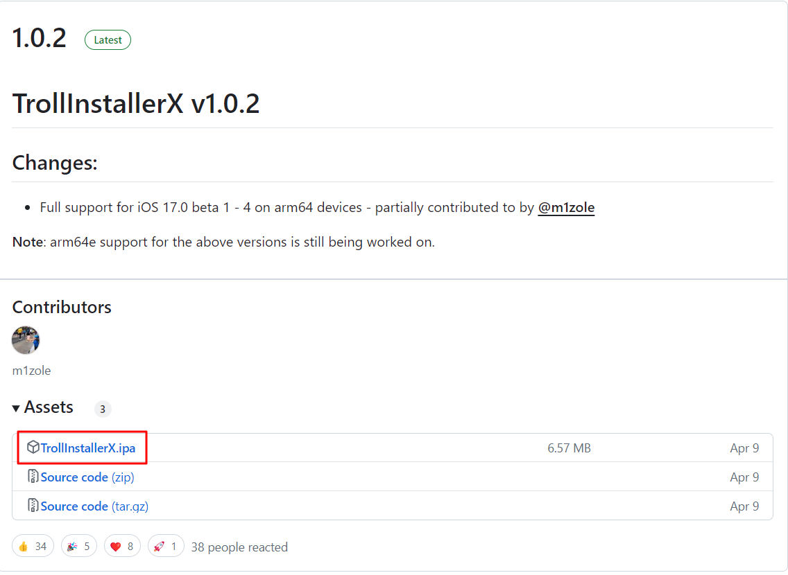 아래 링크로 들어가 TrollInstallerX을 로컬PC에 다운받아 iOS 단말기에 설치를 해줘야 한다.