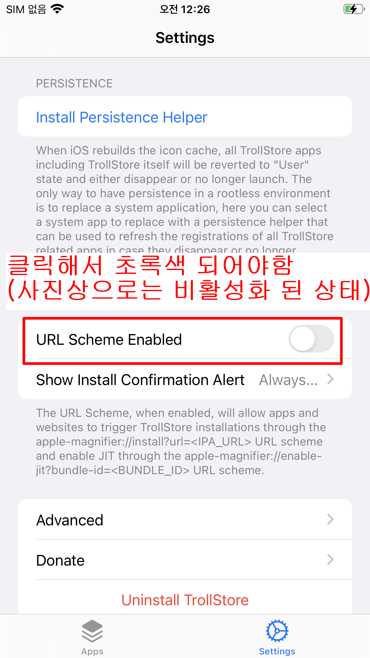일단 여기서 확인해야 하는 건 Trollstore에 접근했을 때 알림창이 뜨고 Rebuild Later과 Rebuild Now 중에 Rebuild Now를 클릭하는 것과 ettings → URL scheme Enabled 클릭 활성화가 되어 있는지만 확인하면 된다. Rebuild Now를 클릭하면 재시작이(?) 시작된다.