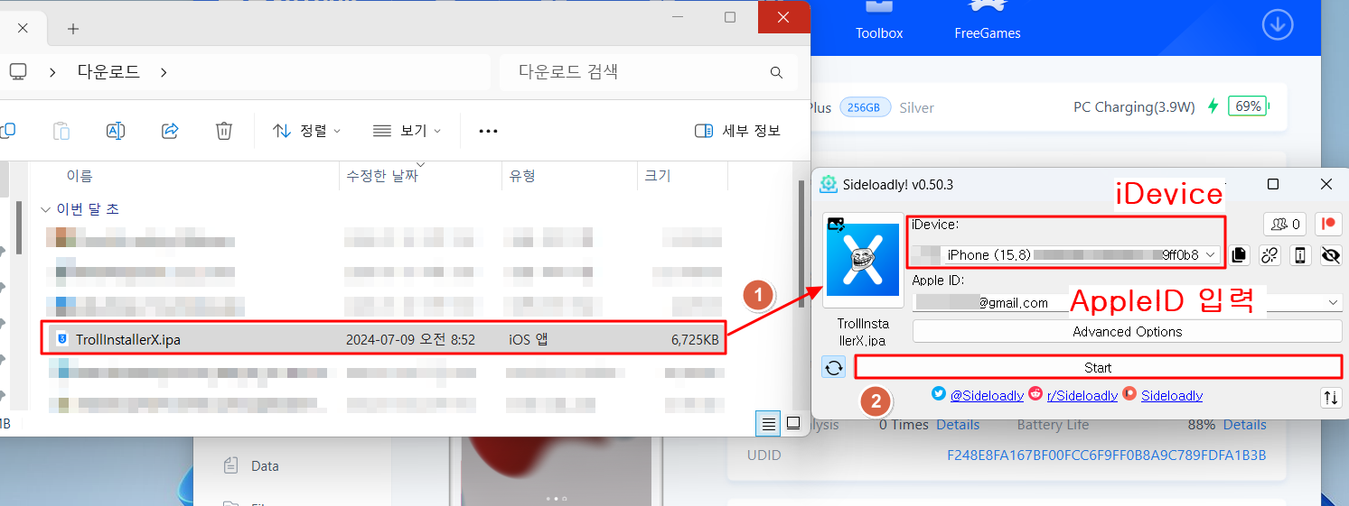 로컬 PC에 다운을 받았다면 Sideloadly를 이용해서 단말기에 설치를 진행해 줘야 한다.