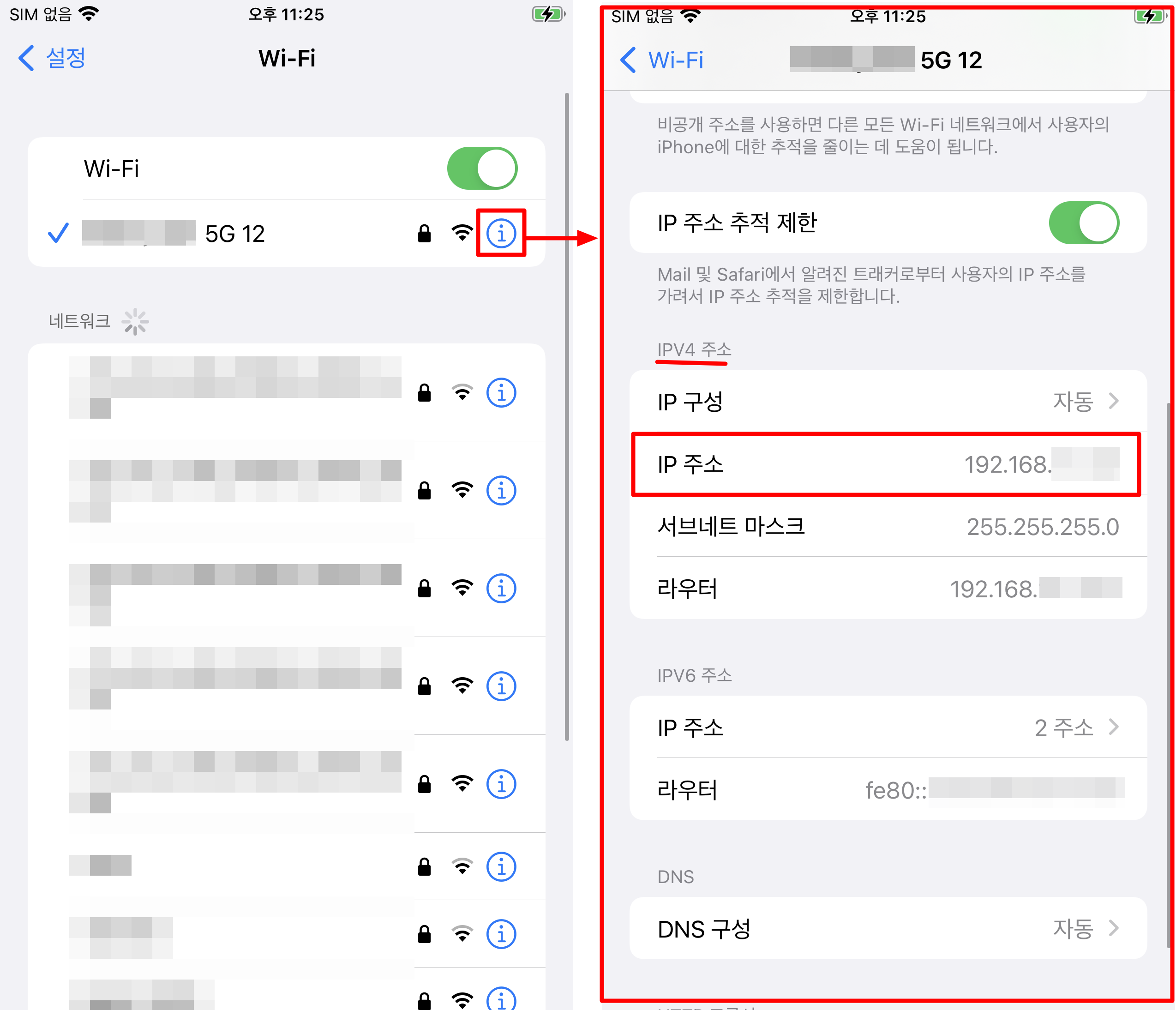 단말기 IP 보는 방법은 설정 → WIFI →연결된 와이파이 오른쪽 i 모양을 클릭 → 스크롤을 조금 내리면 IPV4 주소 → IP주소 확인하면 된다.