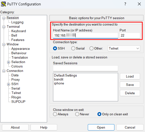 이후 PuTTy를 설치한 후 Host Name에 단말기의 IP를 입력하고 Port는 22로 고정하여 설정해 준다. 이후 원래대로 연결해 주면 끊기지 않고 잘 연결이 된다.