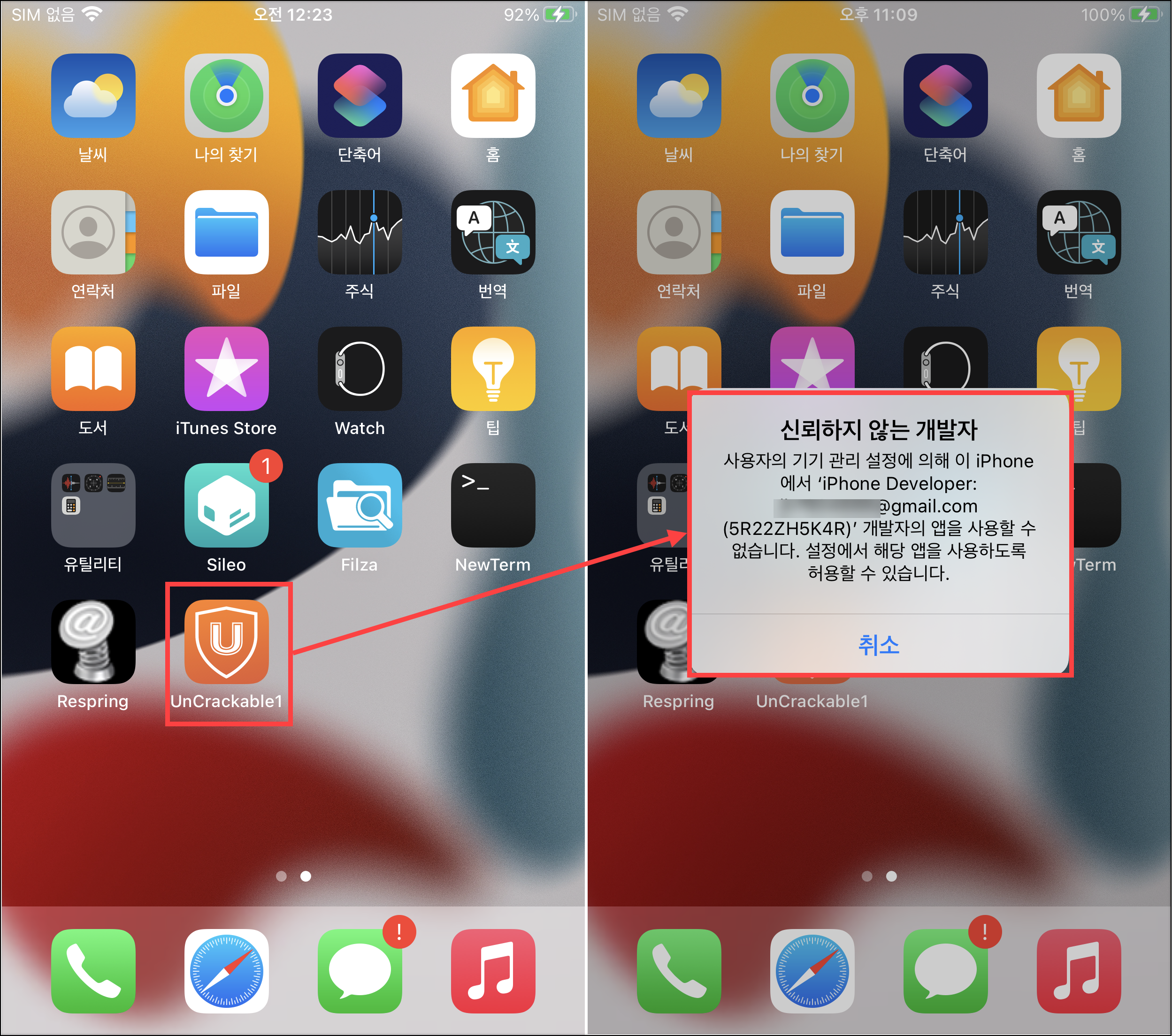 3) 설치한 앱에 접근을 하면 아래 사진과 같이 '신뢰하지 않는 개발자'라며 앱이 실행되지 않는다. 그래서 설정을 통해 신뢰하는 앱으로 변경해줘야 한다.