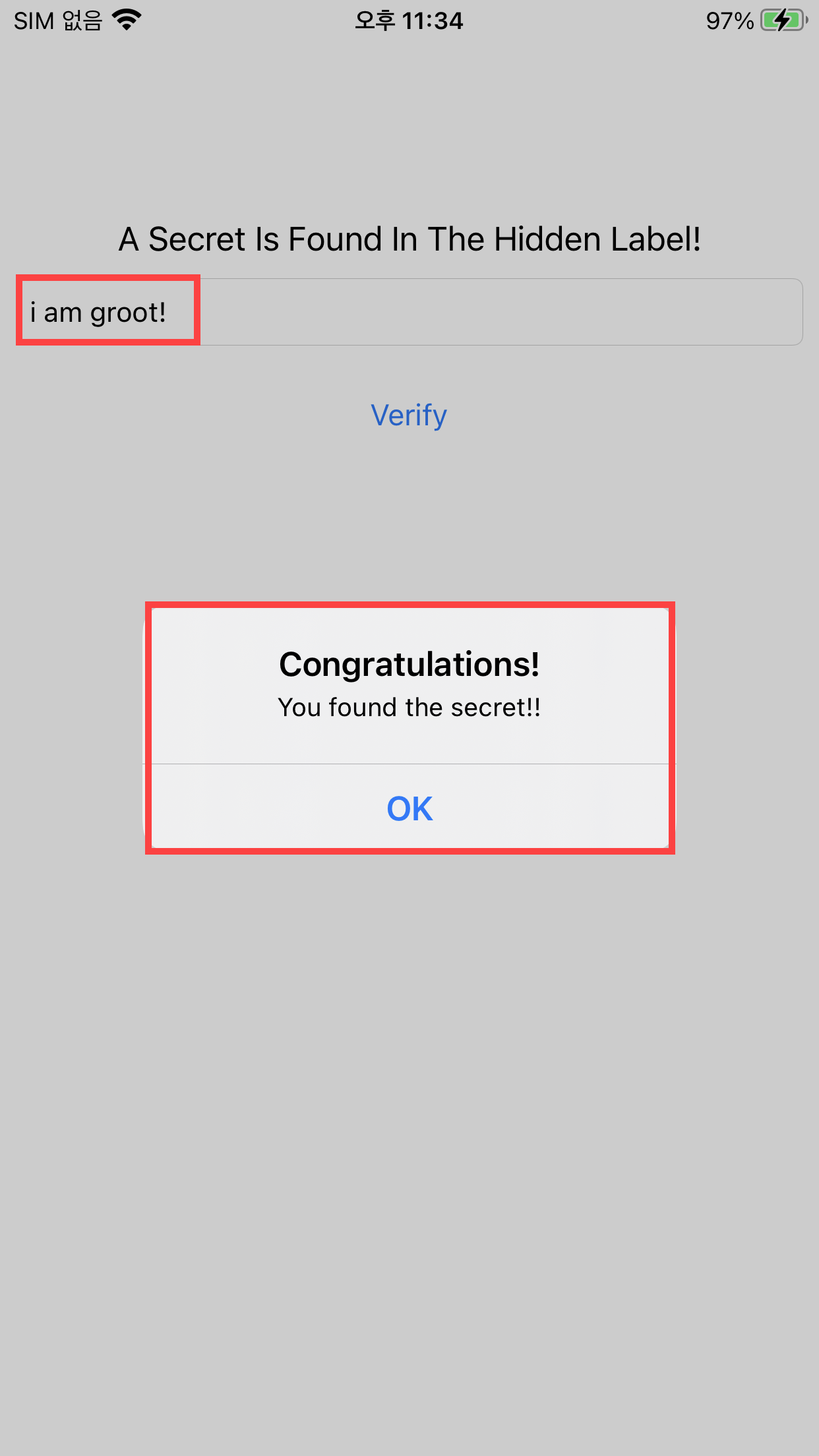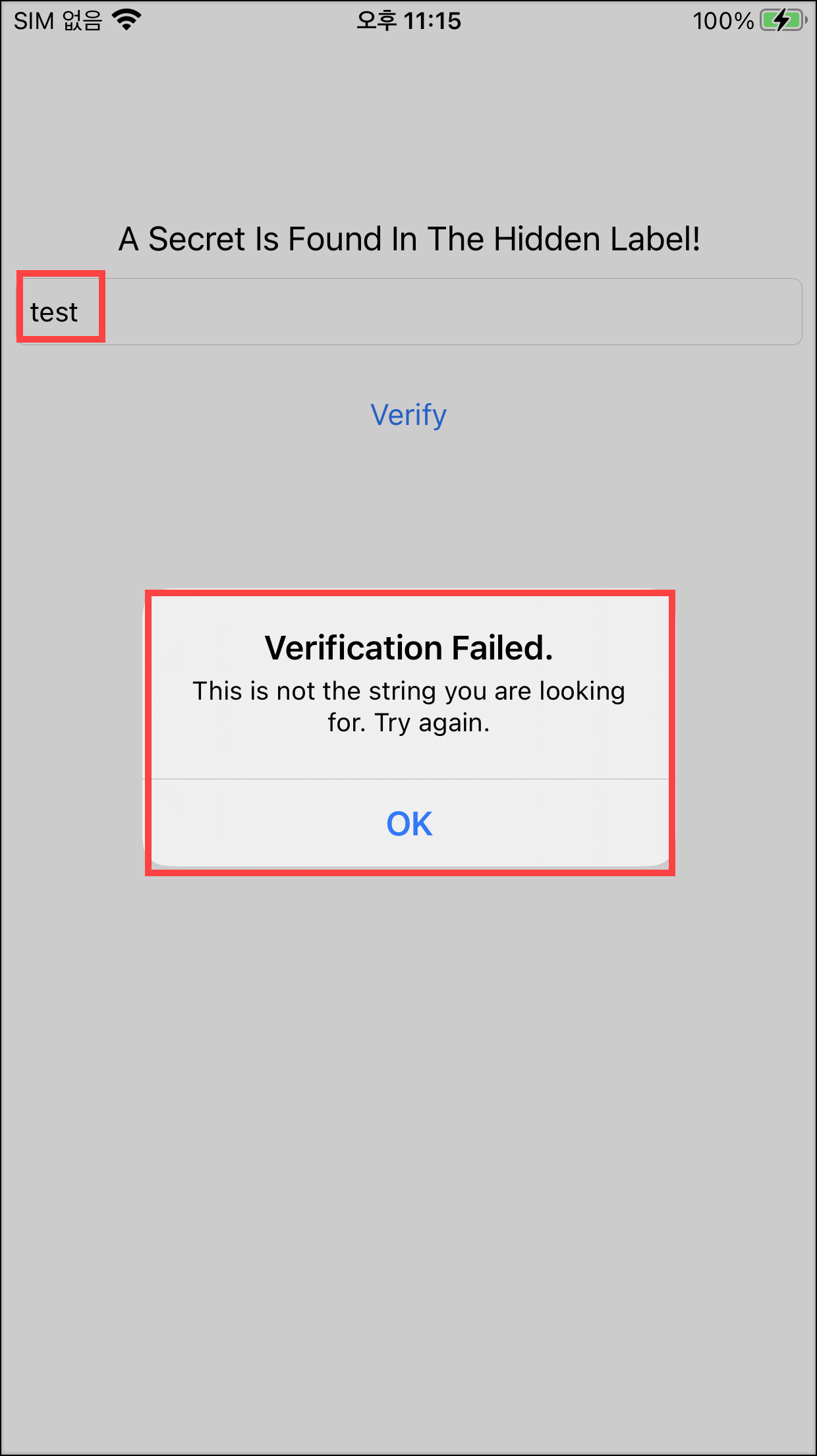 Step1) 앱 실행 후 입력하는 창이 보며 'test'라는 문자열을 작성해 봤는데, 'Verification Failed'라고 알림 창이 떴다. 숨겨진 라벨의 비밀을 찾아야 하는 거 같다.