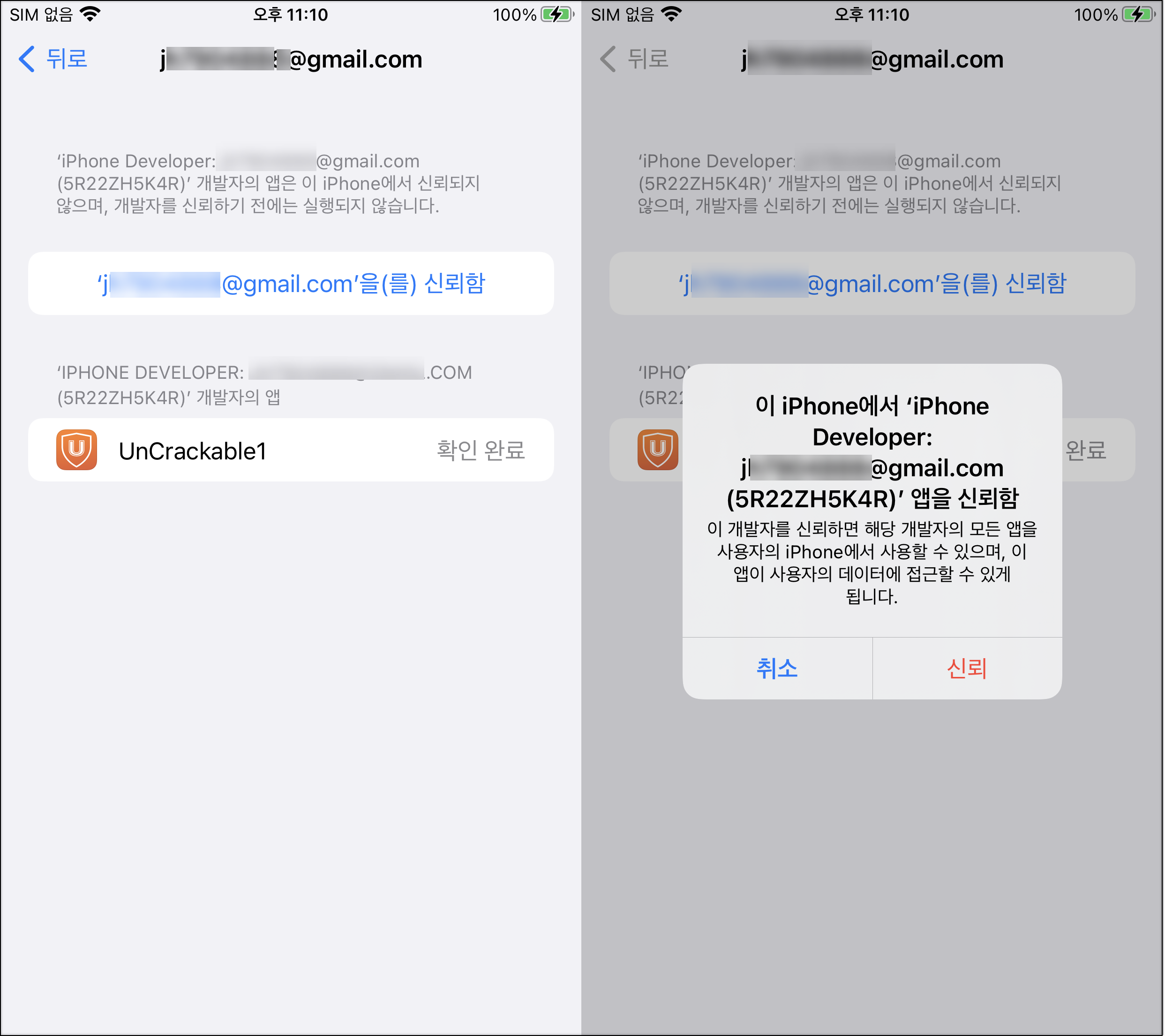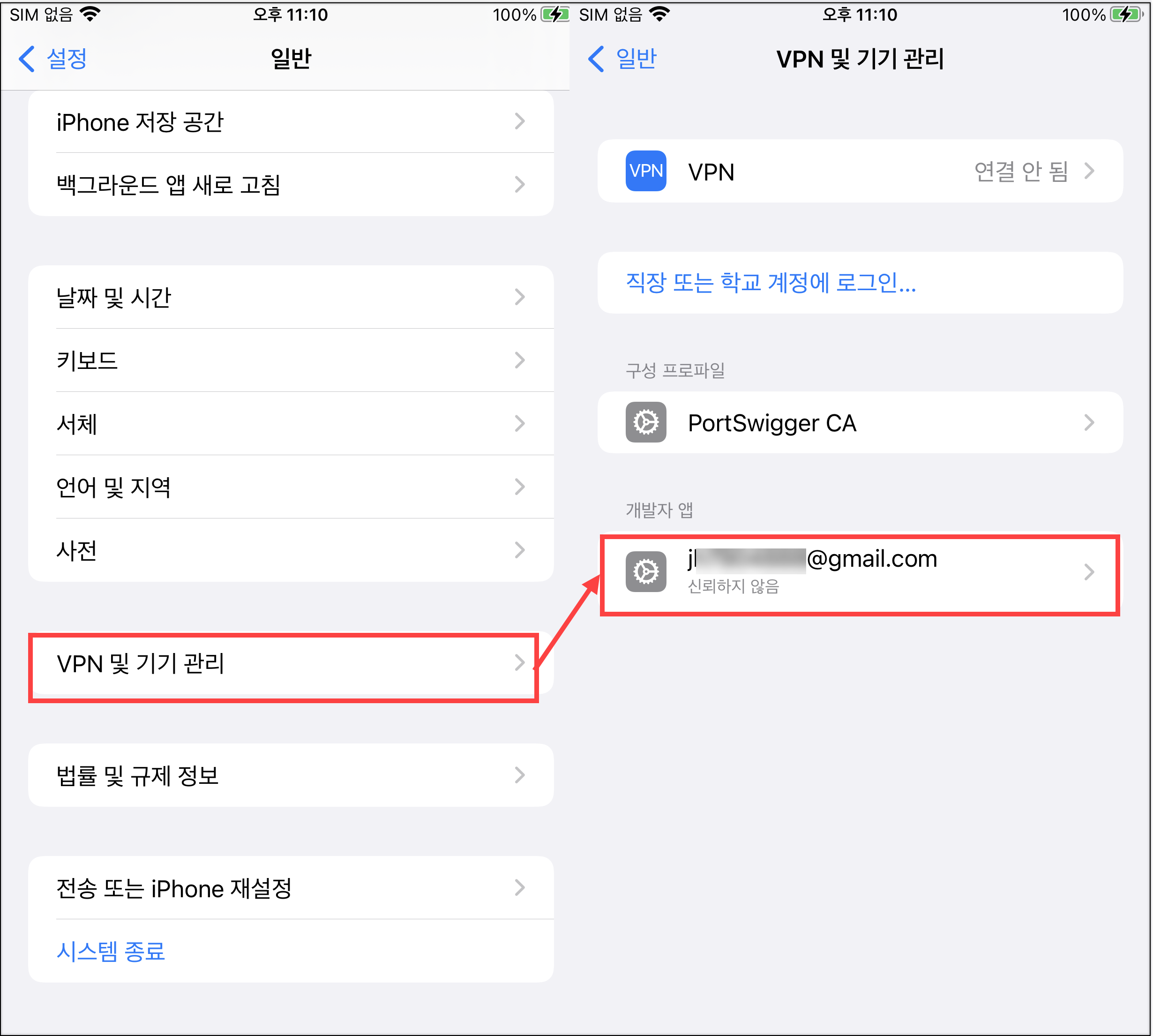 4) '설정 > 일반 > VPN 및 기기 관리'에 접근하여 신뢰하도록 설정을 해줬다.