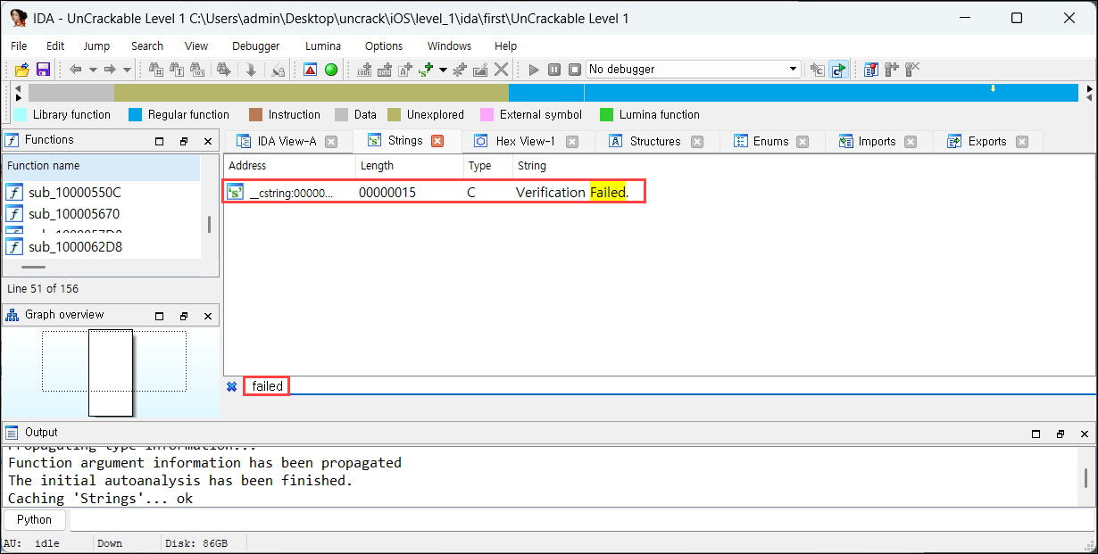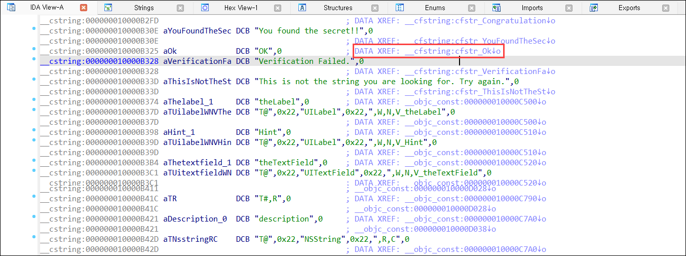 Step3) IDA에서 우리가 유일하게 가지고 있는 단서인 'Verification Failed' 문자열을 검색해 봤다. 뭐가 검색되는 것을 볼 수 있다.