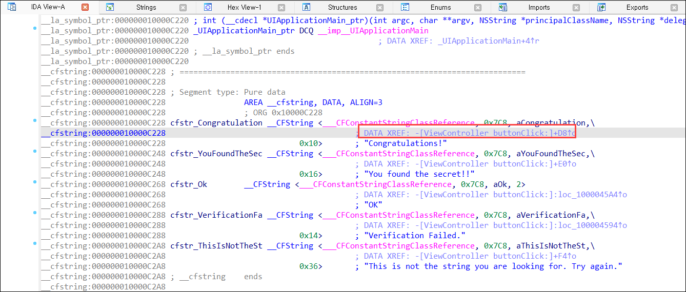 Step9) 그렇다면 사용자의 입력 값(v7)과 v11을 비교해서 v7이 v11과 같다면 'Congratulations!'를 출력하게 된다. v11이 무엇인지 찾아야 한다. v11의 흐름을 따라가 보면 마지막 v8에서 현재 ViewController 화면에서 theLabel이라는 UILabel 객체를 가져와 v8에 저장하는 것으로 추측된다.