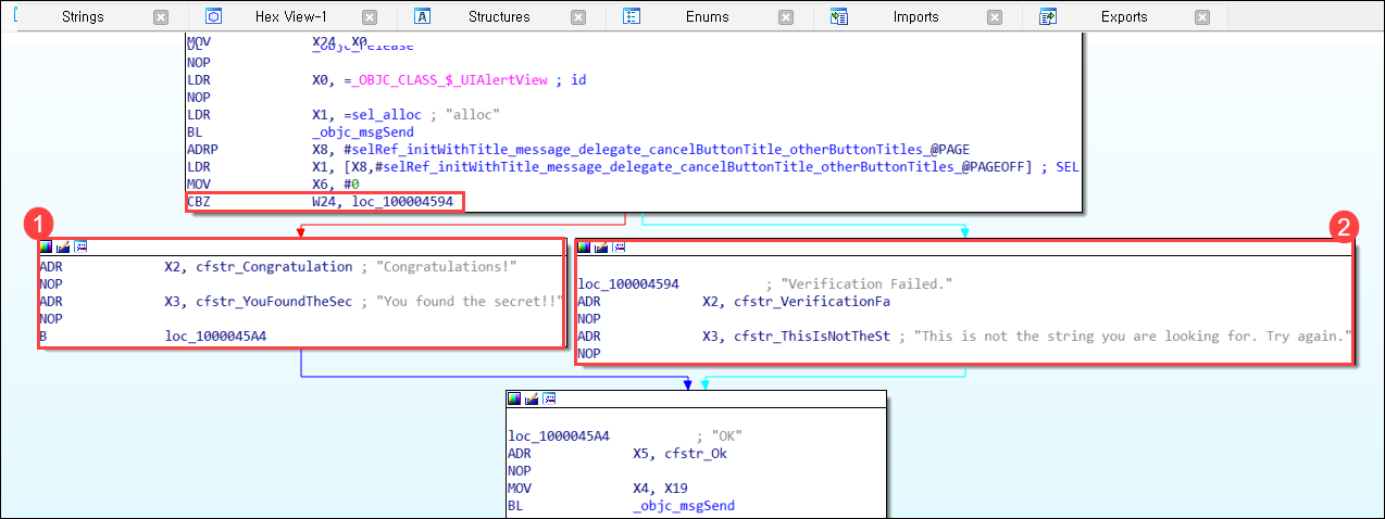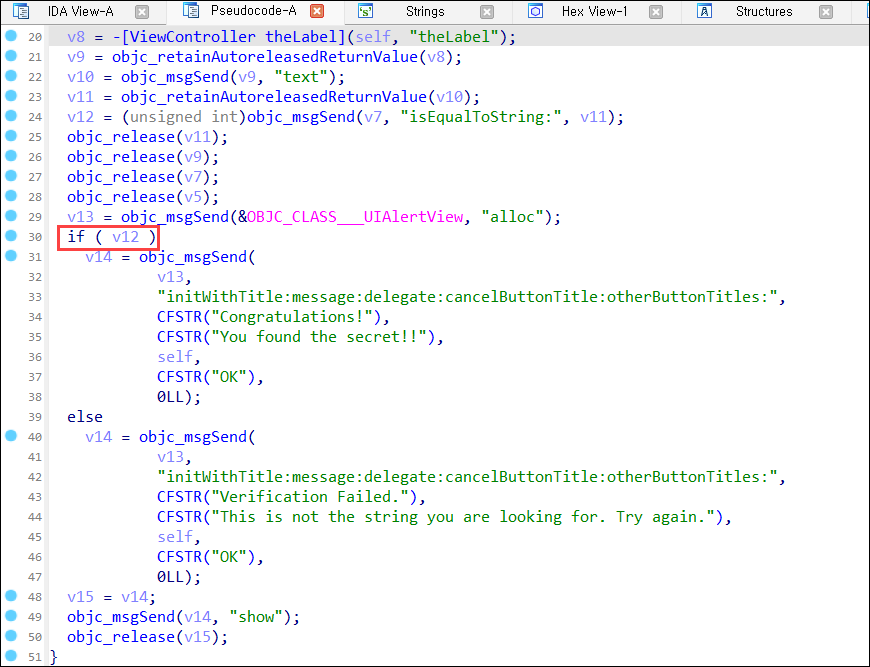 Step7) if(v12) 조건에서 v12 값이 True일 때 'Congratulations!'을 띄운다. V12는 objc_msgSend를 직접 호출하는 방식으로, v7의 객체가 v11 문자열과 같은지를 확인하는 비교하는 코드이다.