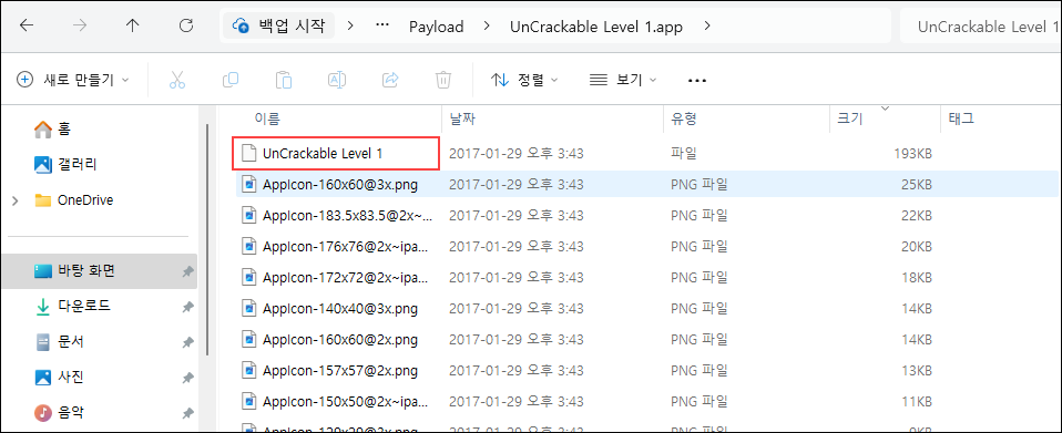 Step2) 정확한 분석을 위해 앱의 바이너리 파일을 IDA를 통해 분석을 했다. 바이너리 파일을 꺼내기 위해서는 다운로드한 IPA의 파일의 확장자를 ZIP으로 변경 후 압축을 풀어준다. (UnCrackable-Level1.ipa → UnCrackable-Levle1.zip)