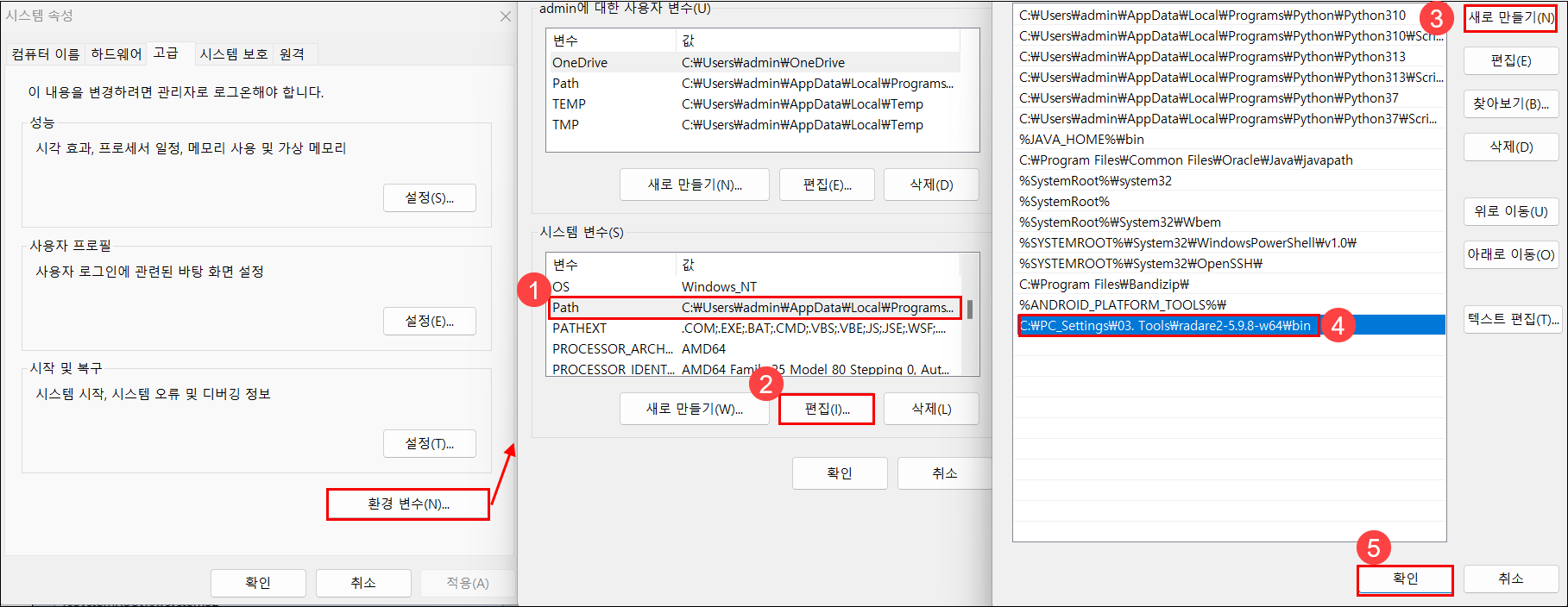 3. '시스템 속성 > 고급 > 환경변수'에 접근하여 exe 파일이 존재하는 위치를 환경 변수로 설정해준다.